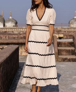 Aspiga Women’s Viola Short Sleeve Organic Cotton Ric Rac Dress | Antique Cream/black | Cream & Black