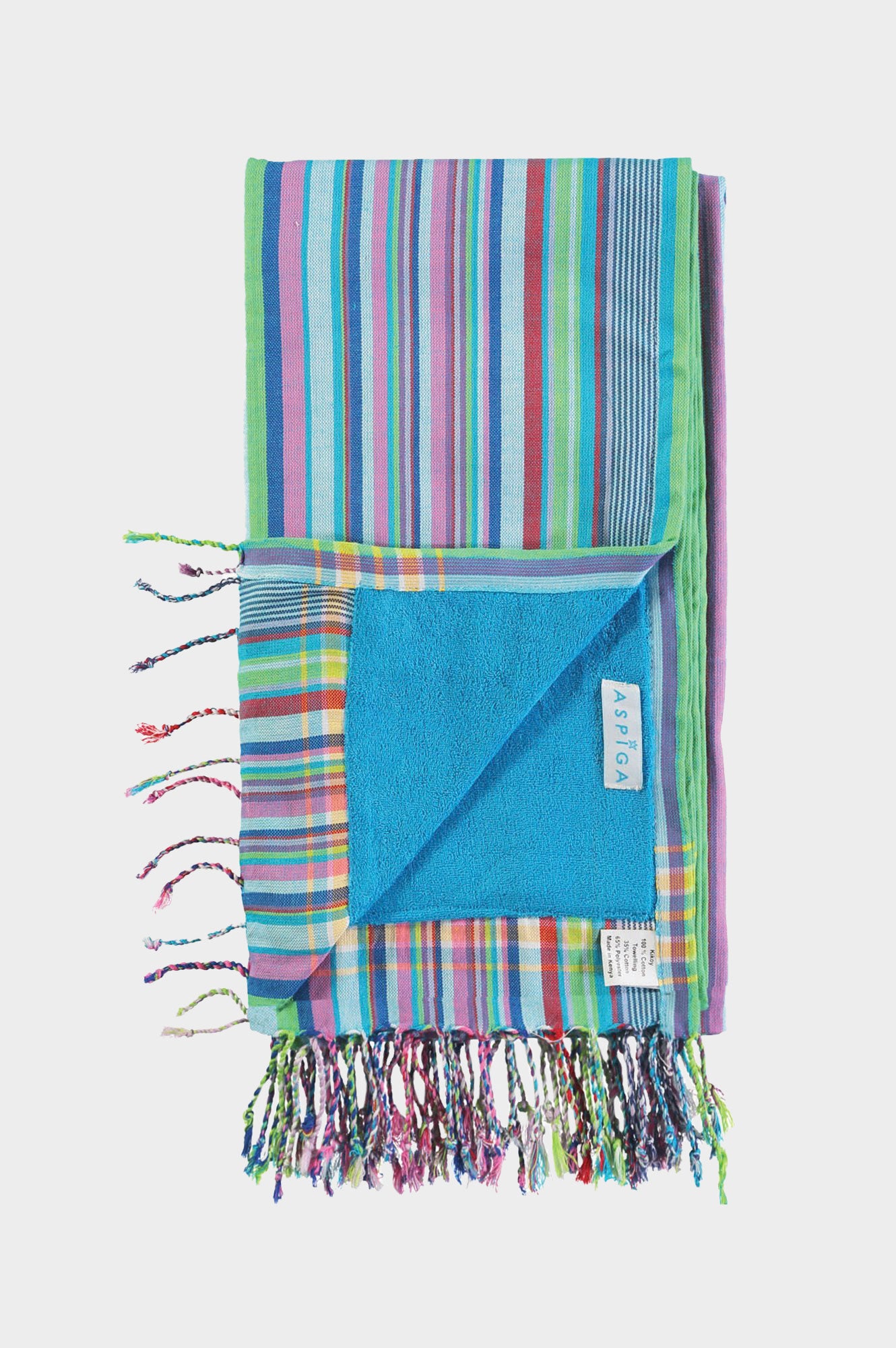Introducing our Kikoy Towel, made from 100% cotton Kikoy with a towelling lining. A traditional East African fabric, handwoven by our artisans. The cotton is dyed with bright dyes creating a vibrant traditional Kenyan design. Not only ideal for the beach, but our Kikoy Towels also double up as a great scarf, picnic rug and colourful furniture throw.