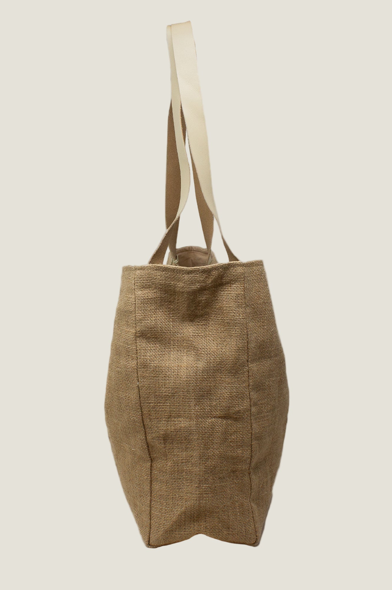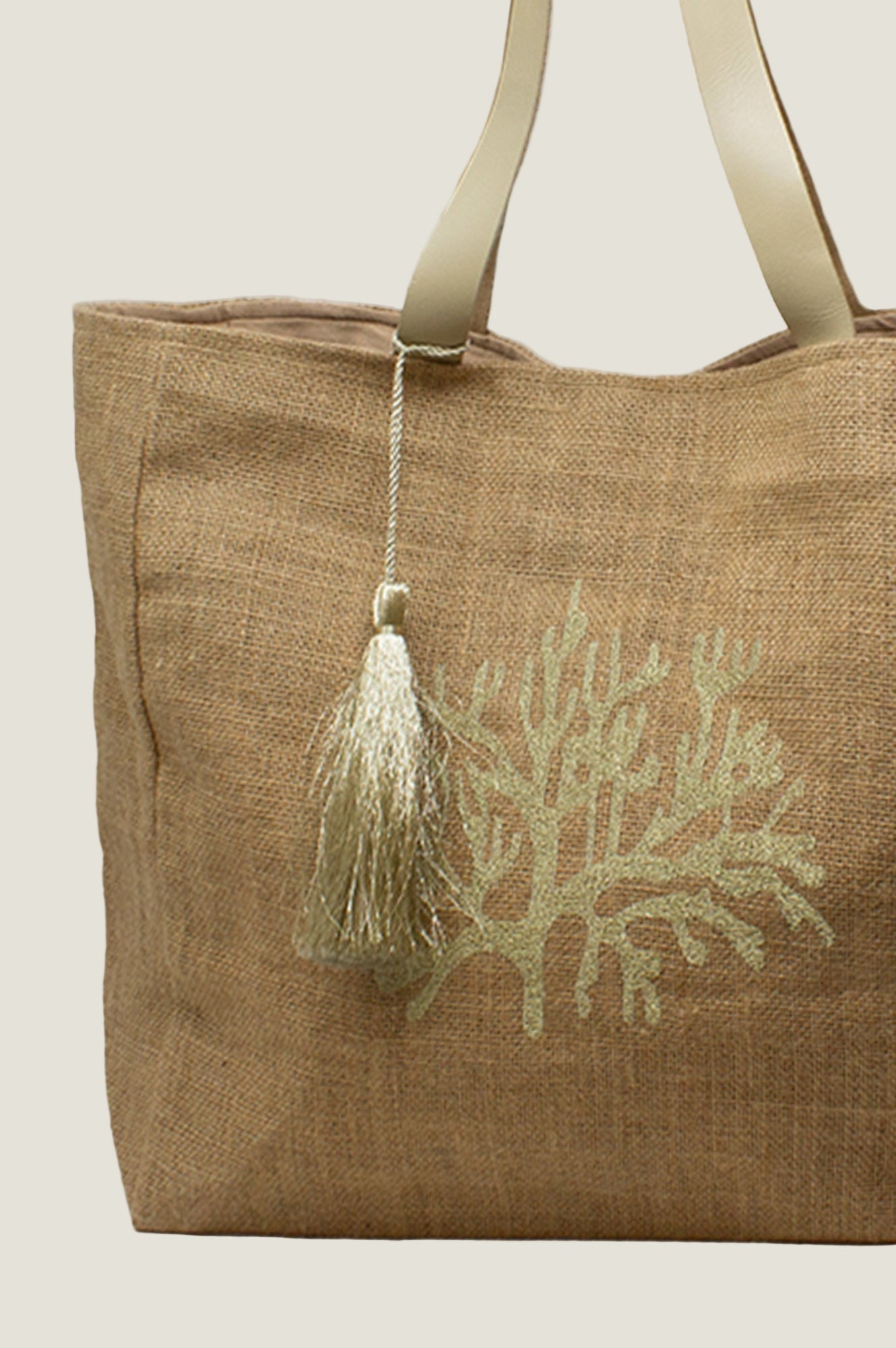 Bringing back our classic Coral Beach Bag made from 100% jute. Featuring two soft leather shoulder straps, an internal pocket for organisation and a magnetic closure. Finished with an embroidered coral motif on the front.