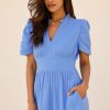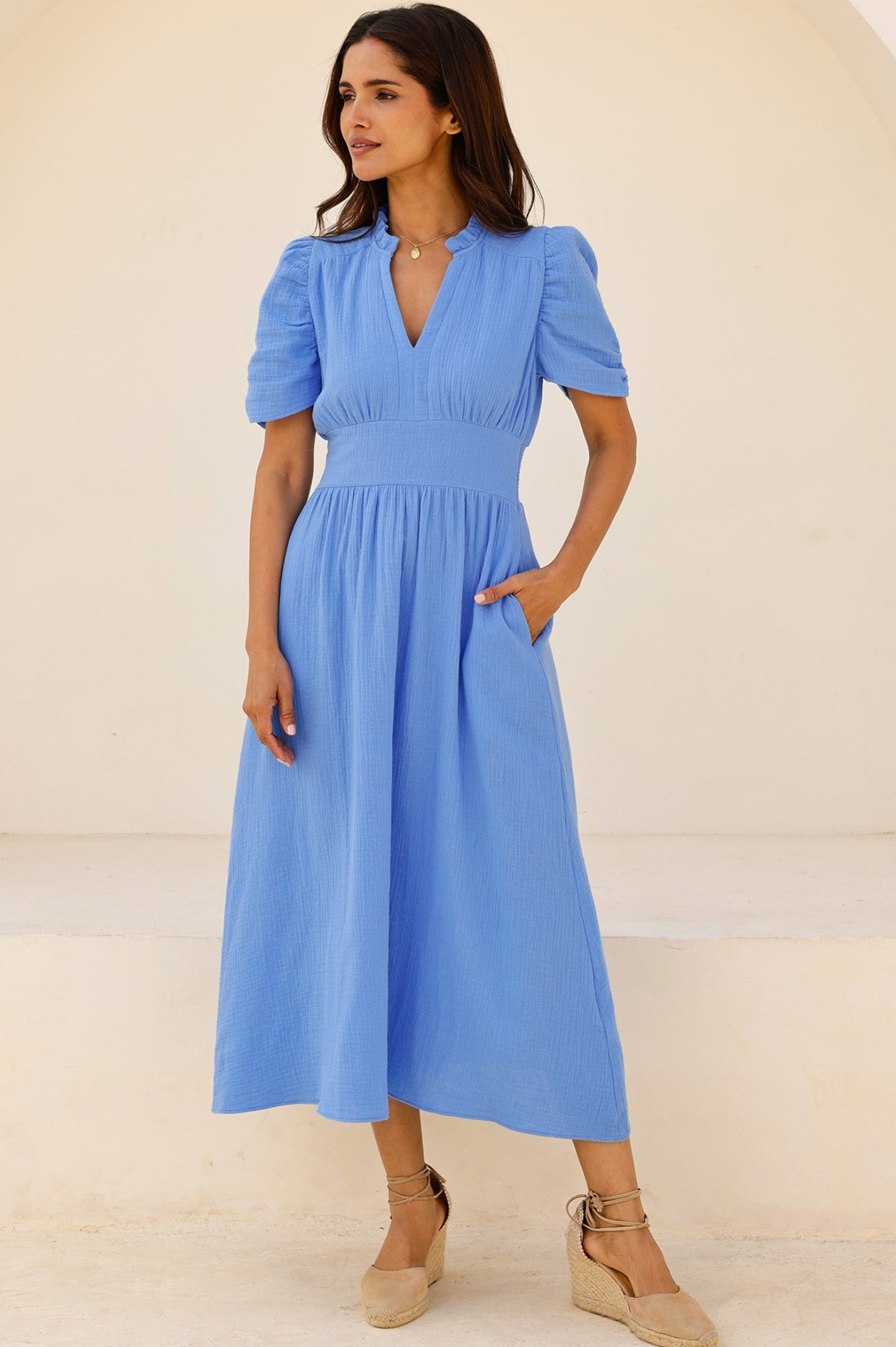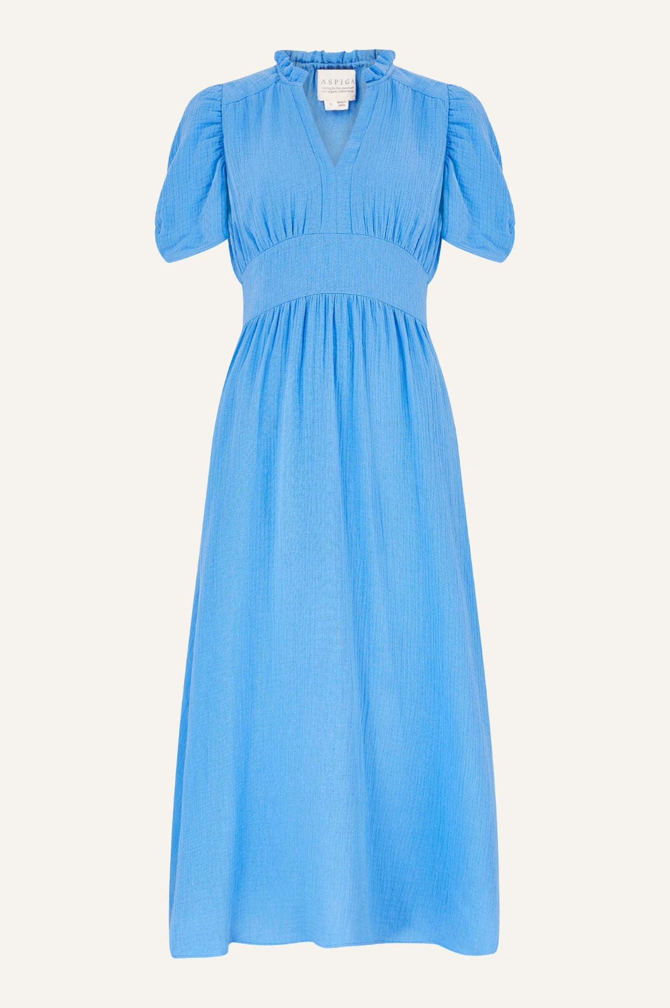 Crafted from responsibly sourced cotton cheesecloth, the Esha Dress features a flattering deep waistband that is shirred at the back for a comfortable, cinched-in fit. It’s beautifully detailed with ruched sleeves, gathering at the sleeve heads, and a V-notch neckline, adding a touch of elegance and charm to its design.