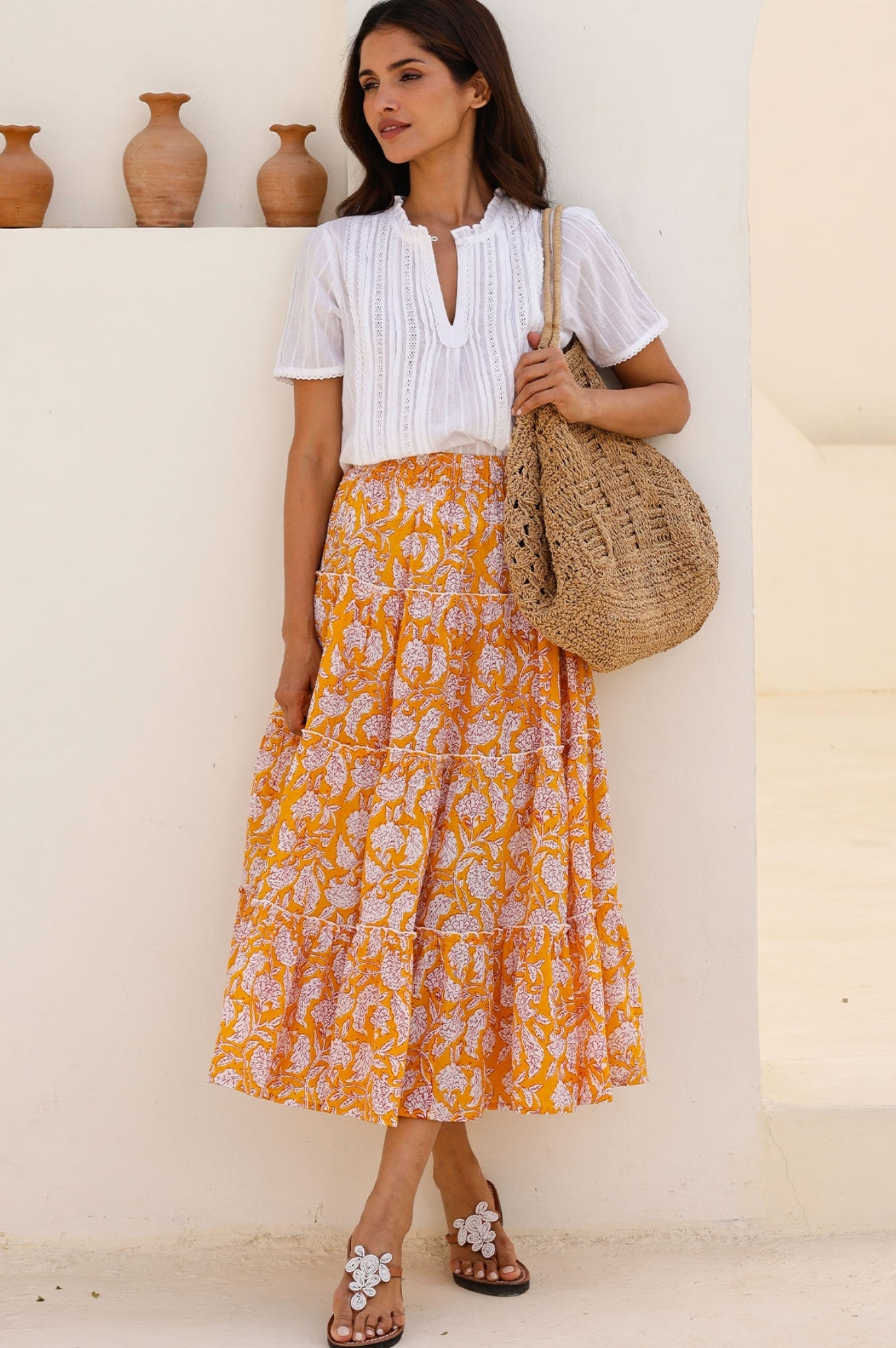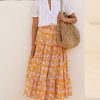 We offer a one-size skirt, made from soft organic cotton. Now in a fun bright new print. Featuring an elasticated waistband, a two-tiered design which is cut to a maxi length. Also finished with a frill detail at each tier.