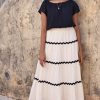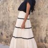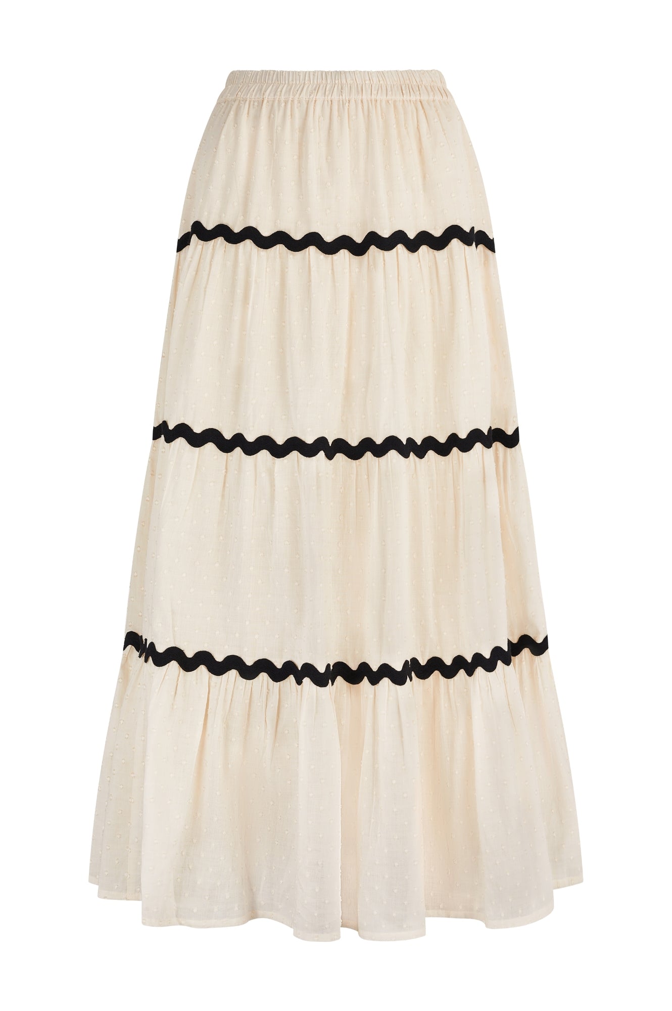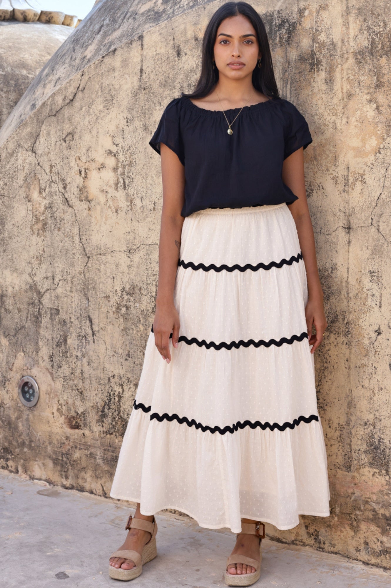 This elegant tiered maxi skirt is crafted from a lightweight cotton dobby which has a soft, breezy feel. The design features contrasting black ric-rac trim across the tiers, adding a touch of charm and bold definition. With its elasticated waistband for a comfortable fit, this skirt is perfect for effortless summer styling, whether paired with a simple blouse or a casual tee.