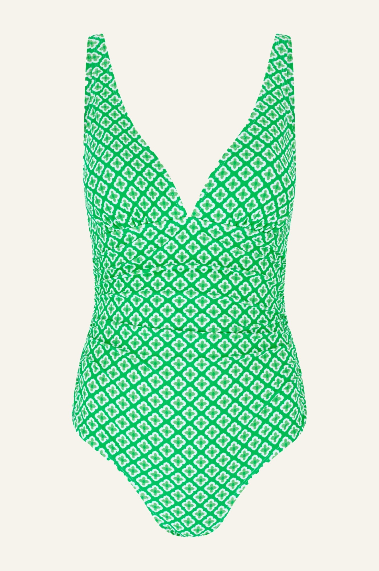 Crafted from recycled nylon, our swimwear is responsibly sourced to minimize waste that would otherwise end up in landfills. Make sure to bring along the V-Neck Ruched Swimsuit for your next vacation. This style boasts a plunging v-neck, padded soft molded cups, and adjustable straps, all made from double-layered fabric for a luxurious finish. The set-in side seams, lightweight control panel, and ruching offer a flattering fit for all body types.