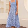 Our Rhianna dress made from printed soft organic cotton. Featuring a square neckline, shirred elasticated bodice and straps with frill detailing. Finished with a single-tier with a midi length dipped hem design.
