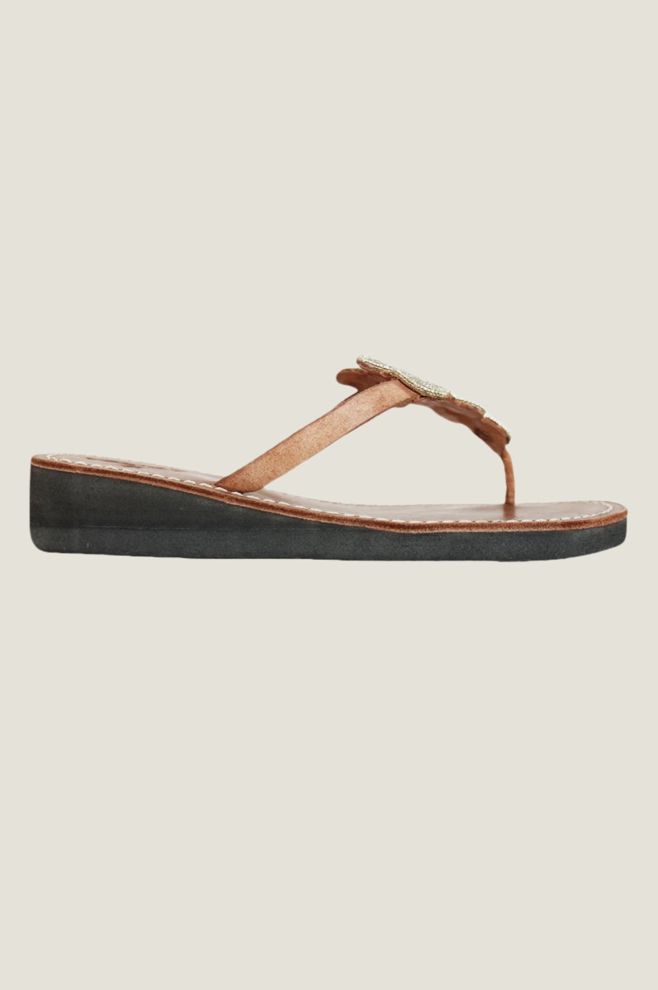 A gorgeous pair of sandals hand-made in Kenya, embellished with sustainable glass beads in a beautiful design. Each pair is lovingly crafted with a leather upper on a heeled recycled rubber sole.