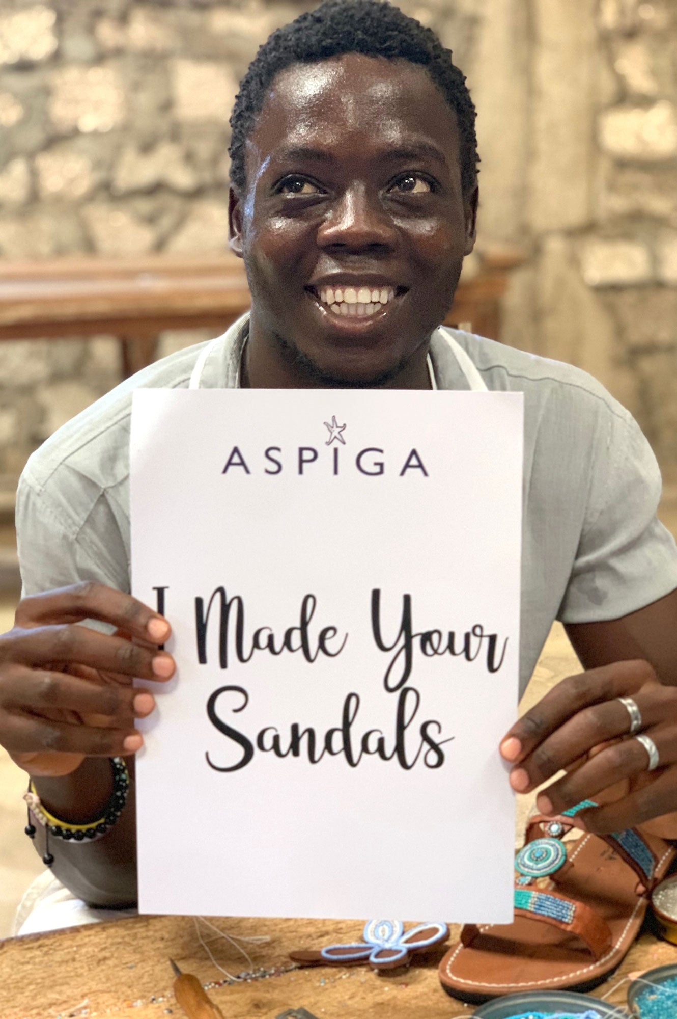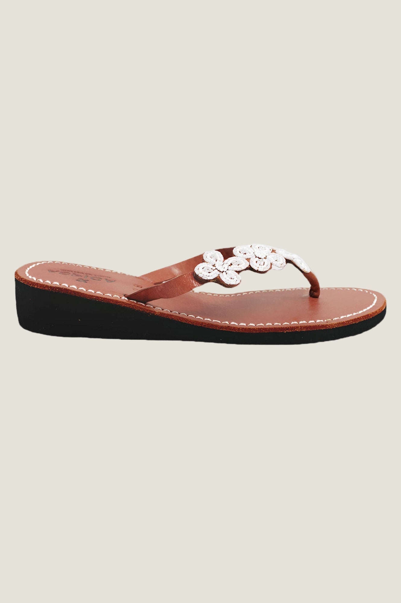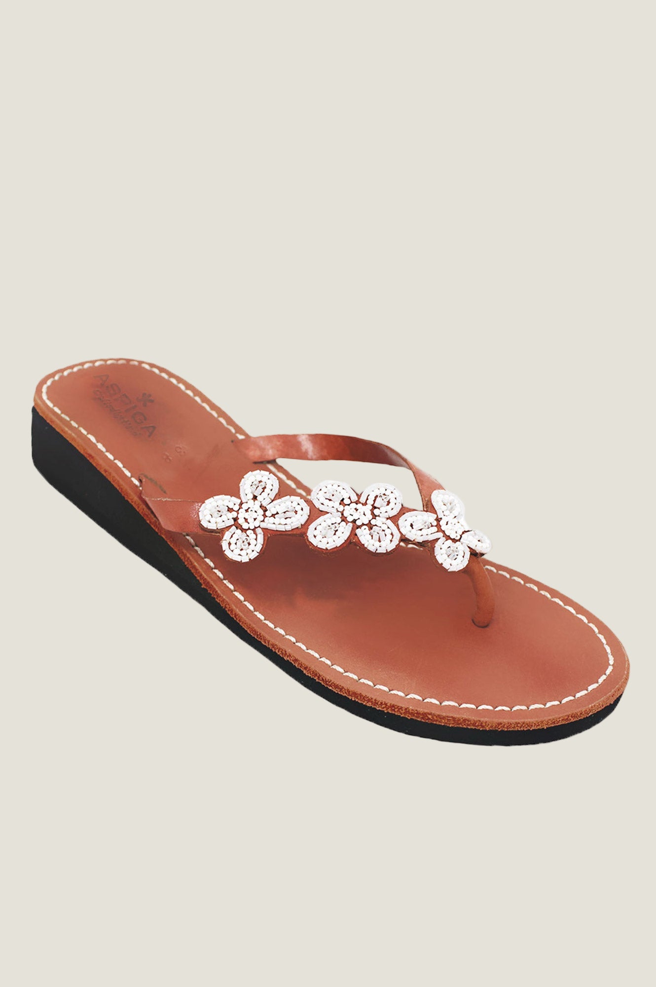 A gorgeous pair of sandals hand-made in Kenya, embellished with sustainable glass beads in a beautiful design. Each pair is lovingly crafted with a leather upper on a heeled recycled rubber sole.