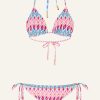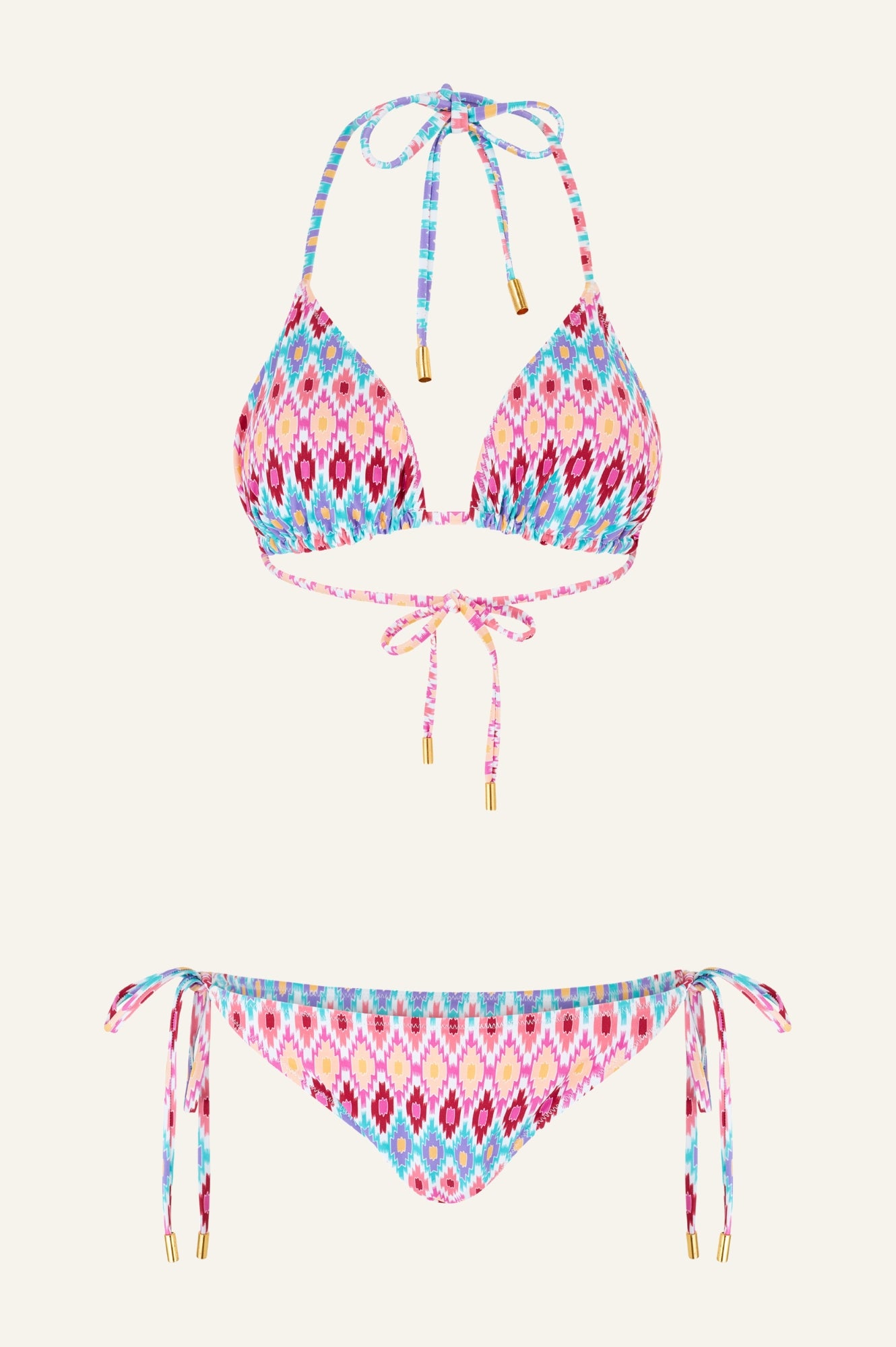 Introducing our triangle string bikini now in a new print this season. Made from recycled nylon. This is a classic shape made from double-layered fabric for a premium finish, paired with matching mid-rise bikini bottoms with adjustable ties at each side.