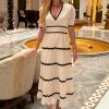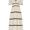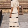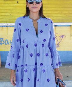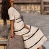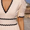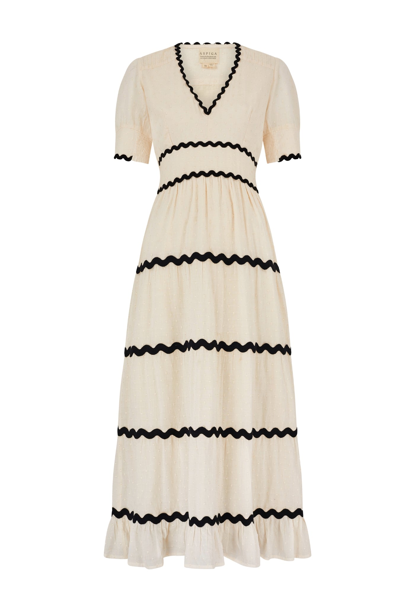 The Viola dress is made from soft organic cotton dobby, offering both comfort and style. It features a flattering V-neckline and short sleeves, accented with black ric rac at the cuffs, waist, tiers, and neckline. The back waistband is shirred for a comfortable, figure-enhancing fit, and the tiered design adds a stylish touch.