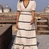 The Viola dress is made from soft organic cotton dobby, offering both comfort and style. It features a flattering V-neckline and short sleeves, accented with black ric rac at the cuffs, waist, tiers, and neckline. The back waistband is shirred for a comfortable, figure-enhancing fit, and the tiered design adds a stylish touch.