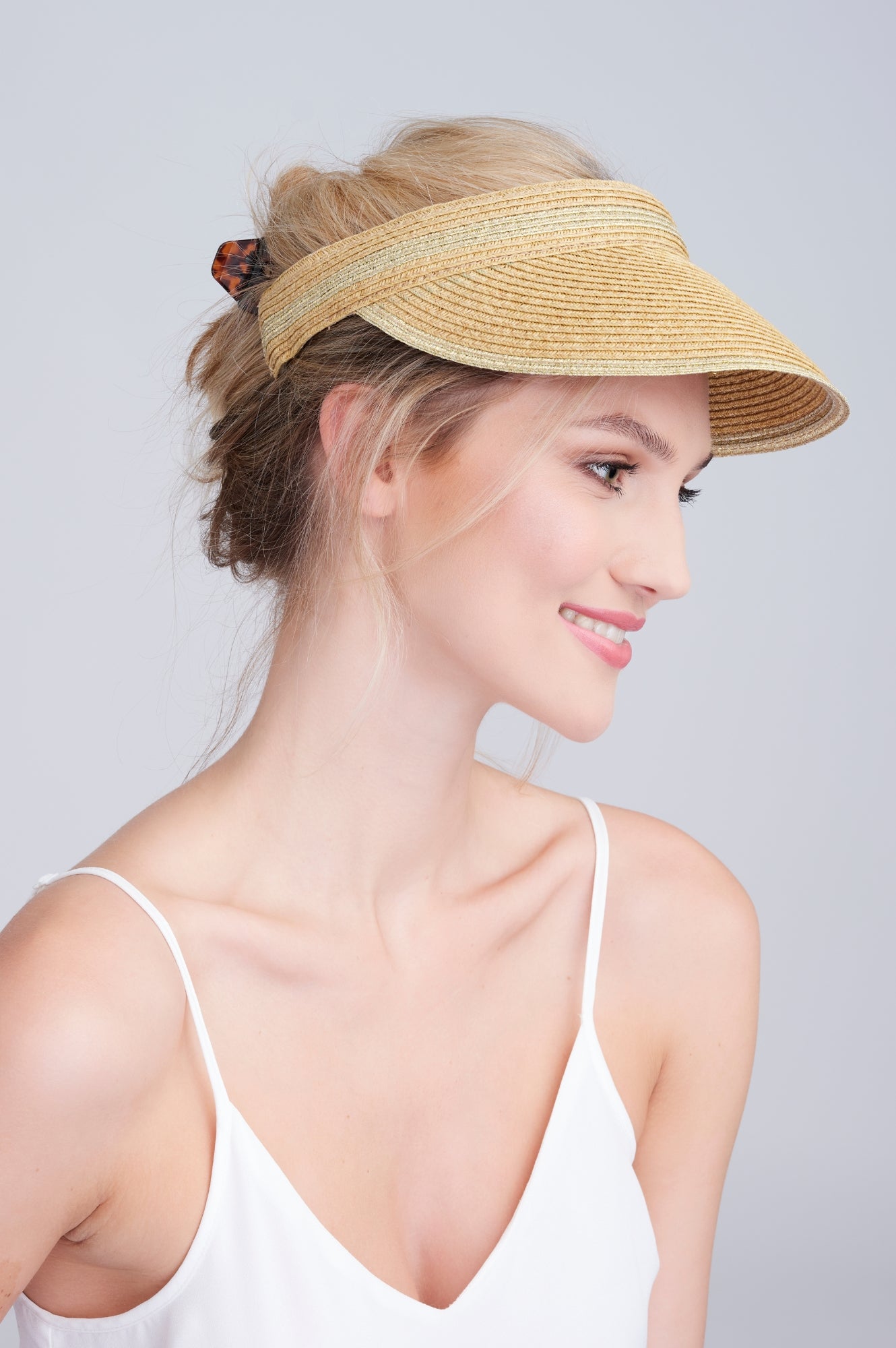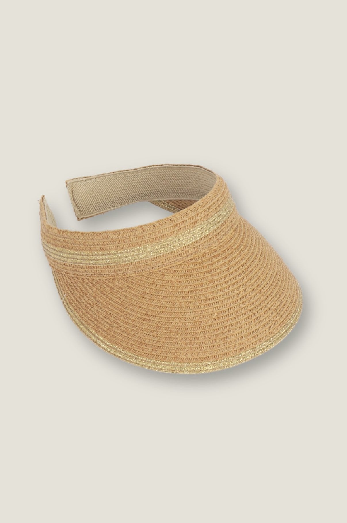 This chic visor is crafted from paper straw and features a trendy gold metallic stripe on the brim and band. The expandable head band ensures a comfortable and adjustable fit, while the metallic thread straw details adds a touch of glamour.